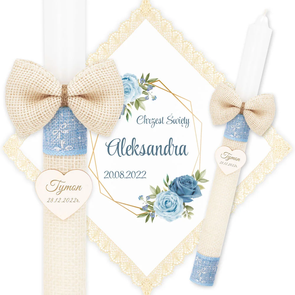 Ręcznie zdobiony zestaw Świeca oraz szatka do Chrztu Świętego.