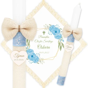 Ręcznie zdobiony zestaw Świeca oraz szatka do Chrztu Świętego.