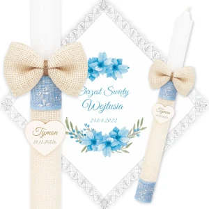 Ręcznie zdobiony zestaw Świeca oraz szatka do Chrztu Świętego.