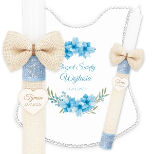 Ręcznie zdobiony zestaw Świeca oraz szatka do Chrztu Świętego.