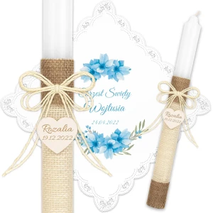 Ręcznie zdobiony zestaw Świeca oraz szatka do Chrztu Świętego.