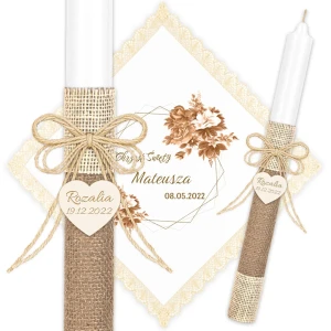 Ręcznie zdobiony zestaw Świeca oraz szatka do Chrztu Świętego.