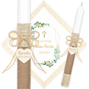 Ręcznie zdobiony zestaw Świeca oraz szatka do Chrztu Świętego.