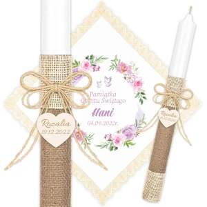 Ręcznie zdobiony zestaw Świeca oraz szatka do Chrztu Świętego.