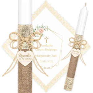 Ręcznie zdobiony zestaw Świeca oraz szatka do Chrztu Świętego.