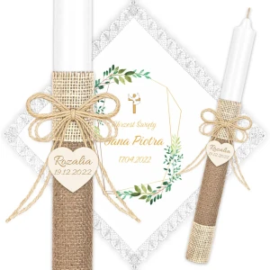 Ręcznie zdobiony zestaw Świeca oraz szatka do Chrztu Świętego.