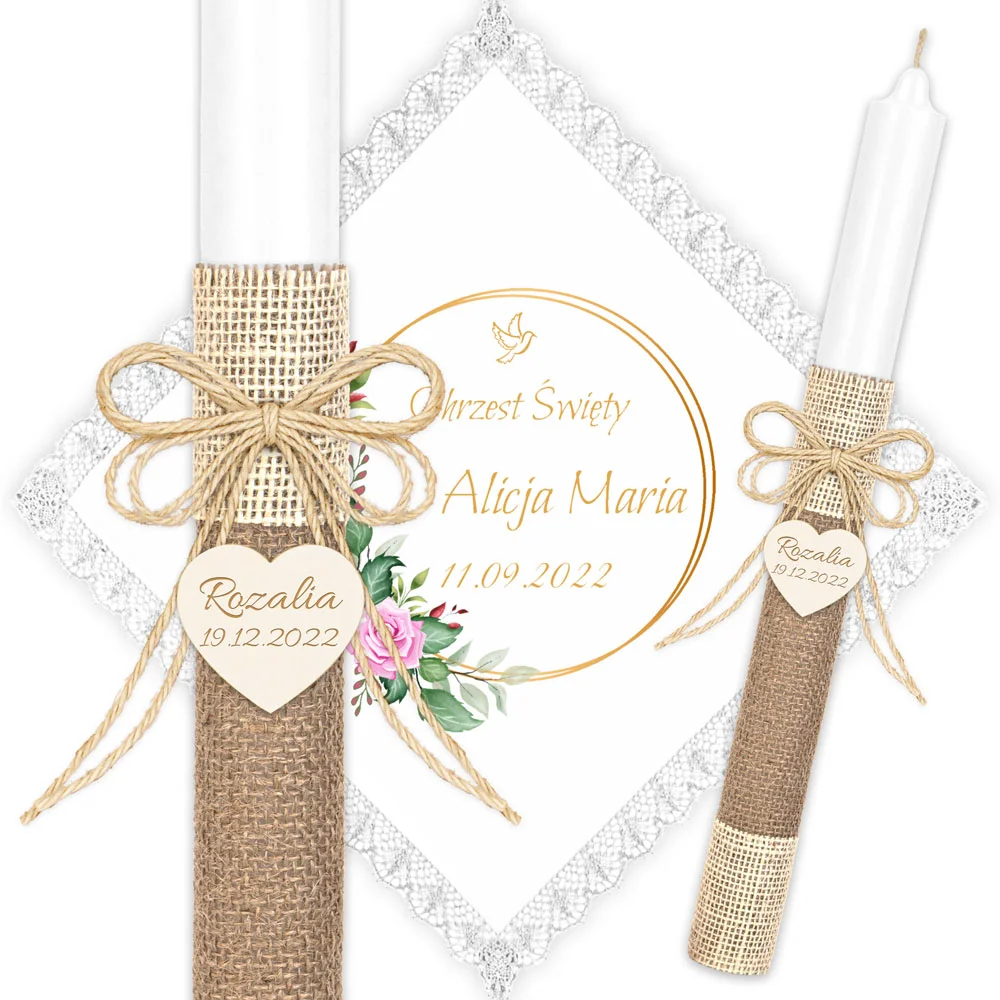 Ręcznie zdobiony zestaw Świeca oraz szatka do Chrztu Świętego.