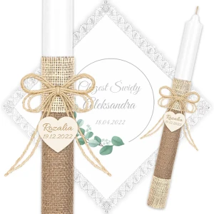 Ręcznie zdobiony zestaw Świeca oraz szatka do Chrztu Świętego.