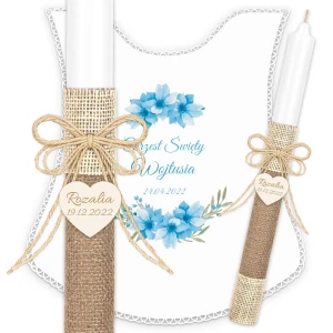 Ręcznie zdobiony zestaw Świeca oraz szatka do Chrztu Świętego.