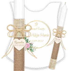 Ręcznie zdobiony zestaw Świeca oraz szatka do Chrztu Świętego.