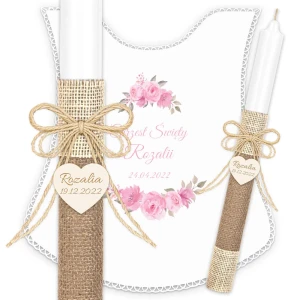 Ręcznie zdobiony zestaw Świeca oraz szatka do Chrztu Świętego.