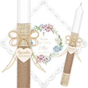 Ręcznie zdobiony zestaw Świeca oraz szatka do Chrztu Świętego.