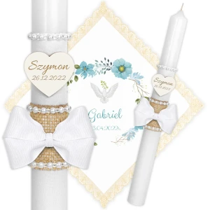 Ręcznie zdobiony zestaw Świeca oraz szatka do Chrztu Świętego.
