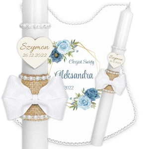 Ręcznie zdobiony zestaw Świeca oraz szatka do Chrztu Świętego.