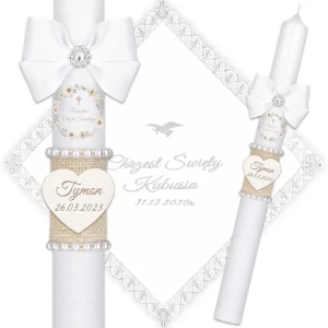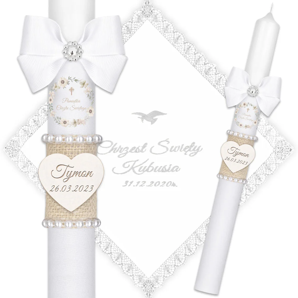 Ręcznie zdobiony zestaw Świeca oraz szatka do Chrztu Świętego.
