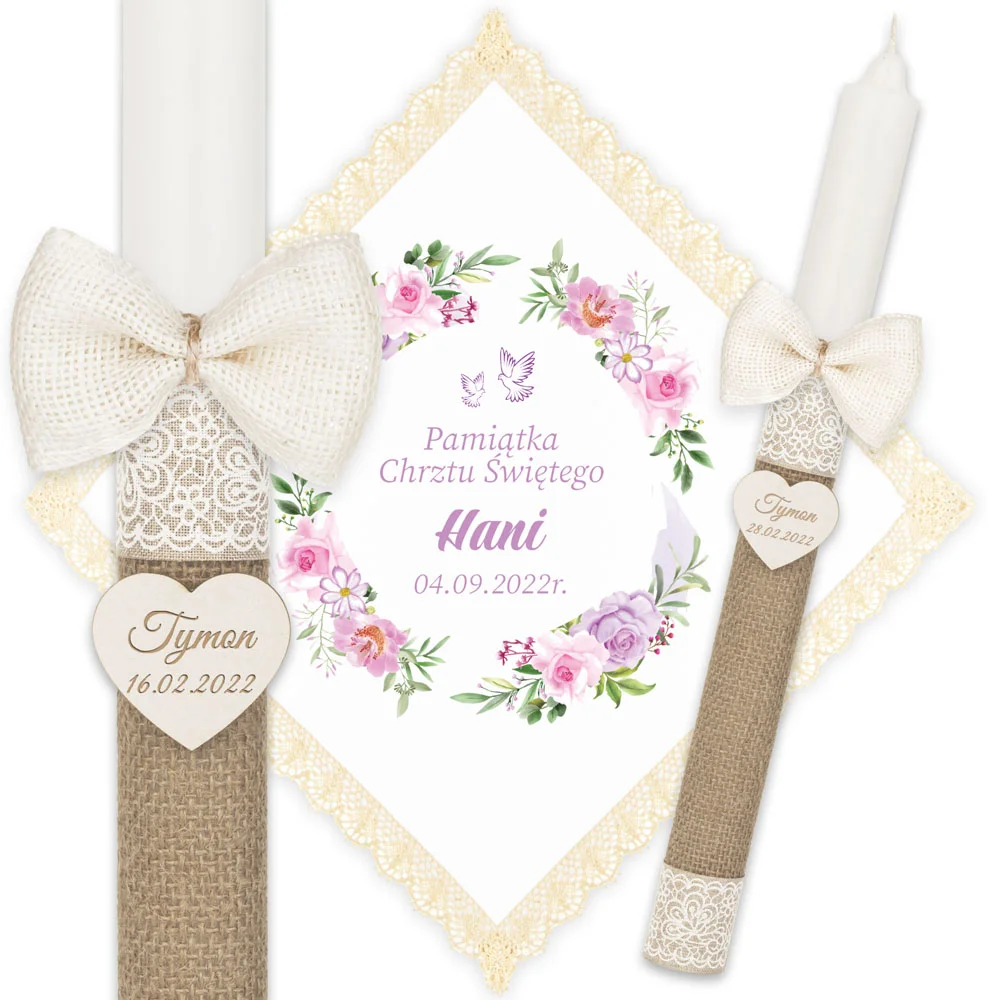 Ręcznie zdobiony zestaw Świeca oraz szatka do Chrztu Świętego.