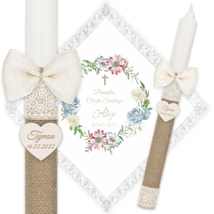 Ręcznie zdobiony zestaw Świeca oraz szatka do Chrztu Świętego.