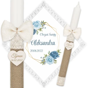 Ręcznie zdobiony zestaw Świeca oraz szatka do Chrztu Świętego.