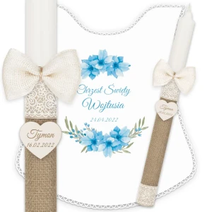 Ręcznie zdobiony zestaw Świeca oraz szatka do Chrztu Świętego.