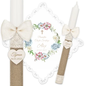 Ręcznie zdobiony zestaw Świeca oraz szatka do Chrztu Świętego.