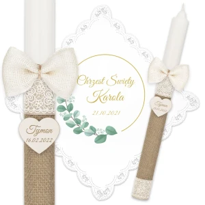Ręcznie zdobiony zestaw Świeca oraz szatka do Chrztu Świętego.