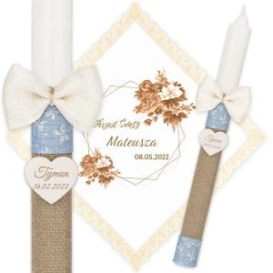 Ręcznie zdobiony zestaw Świeca oraz szatka do Chrztu Świętego.