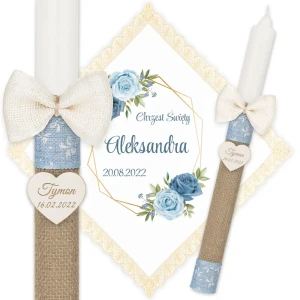 Ręcznie zdobiony zestaw Świeca oraz szatka do Chrztu Świętego.