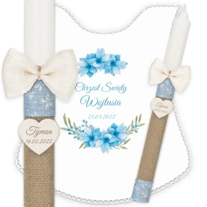Ręcznie zdobiony zestaw Świeca oraz szatka do Chrztu Świętego.