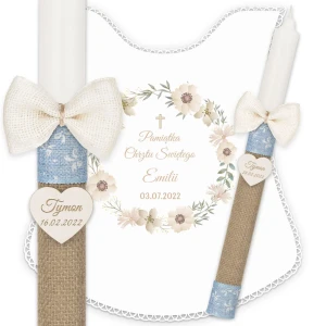 Ręcznie zdobiony zestaw Świeca oraz szatka do Chrztu Świętego.