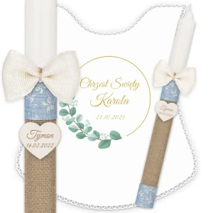 Ręcznie zdobiony zestaw Świeca oraz szatka do Chrztu Świętego.