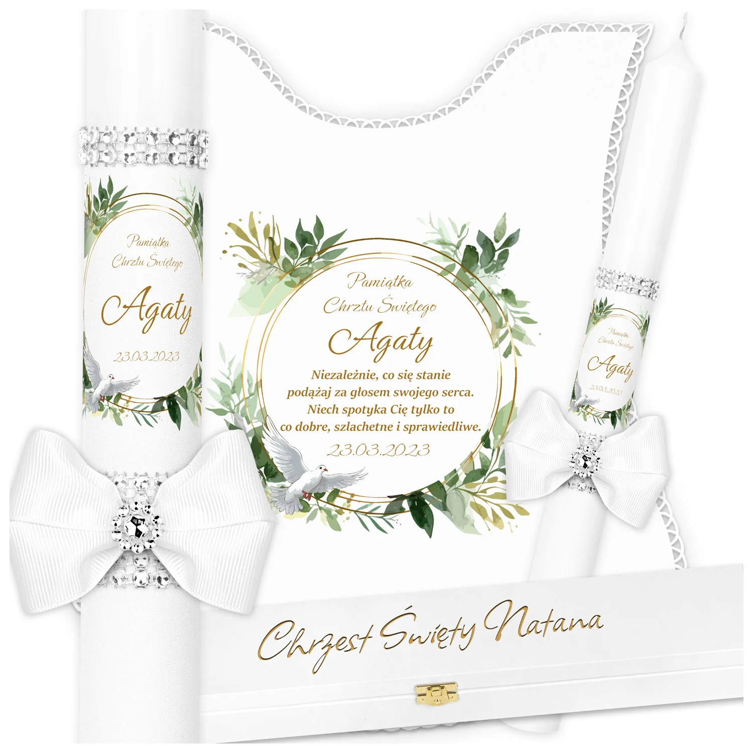 ✅ personalizacja (imię oraz data chrztu) na świecy oraz szatce.