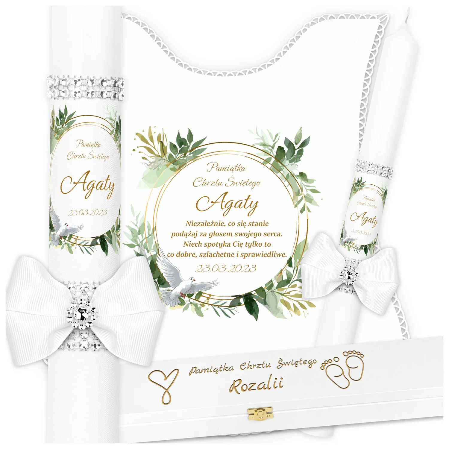 ✅ personalizacja (imię oraz data chrztu) na świecy oraz szatce.