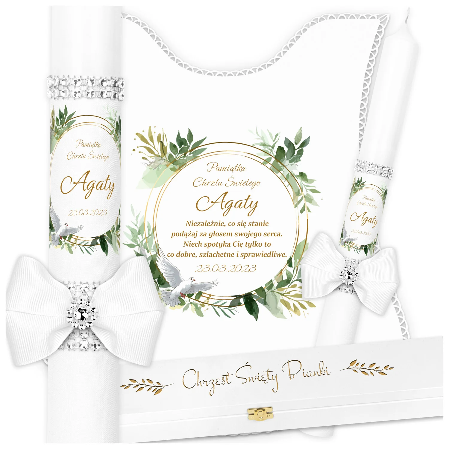 ✅ personalizacja (imię oraz data chrztu) na świecy oraz szatce.