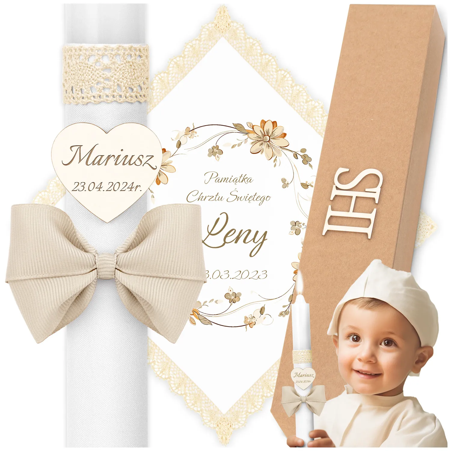 Świeca i kremowa szatka na chrzest + Pudełko do Chrztu C71S33P22