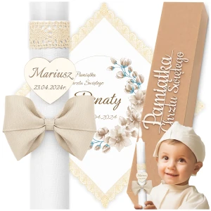 Świeca i kremowa szatka na chrzest + Pudełko do Chrztu C71S50P15