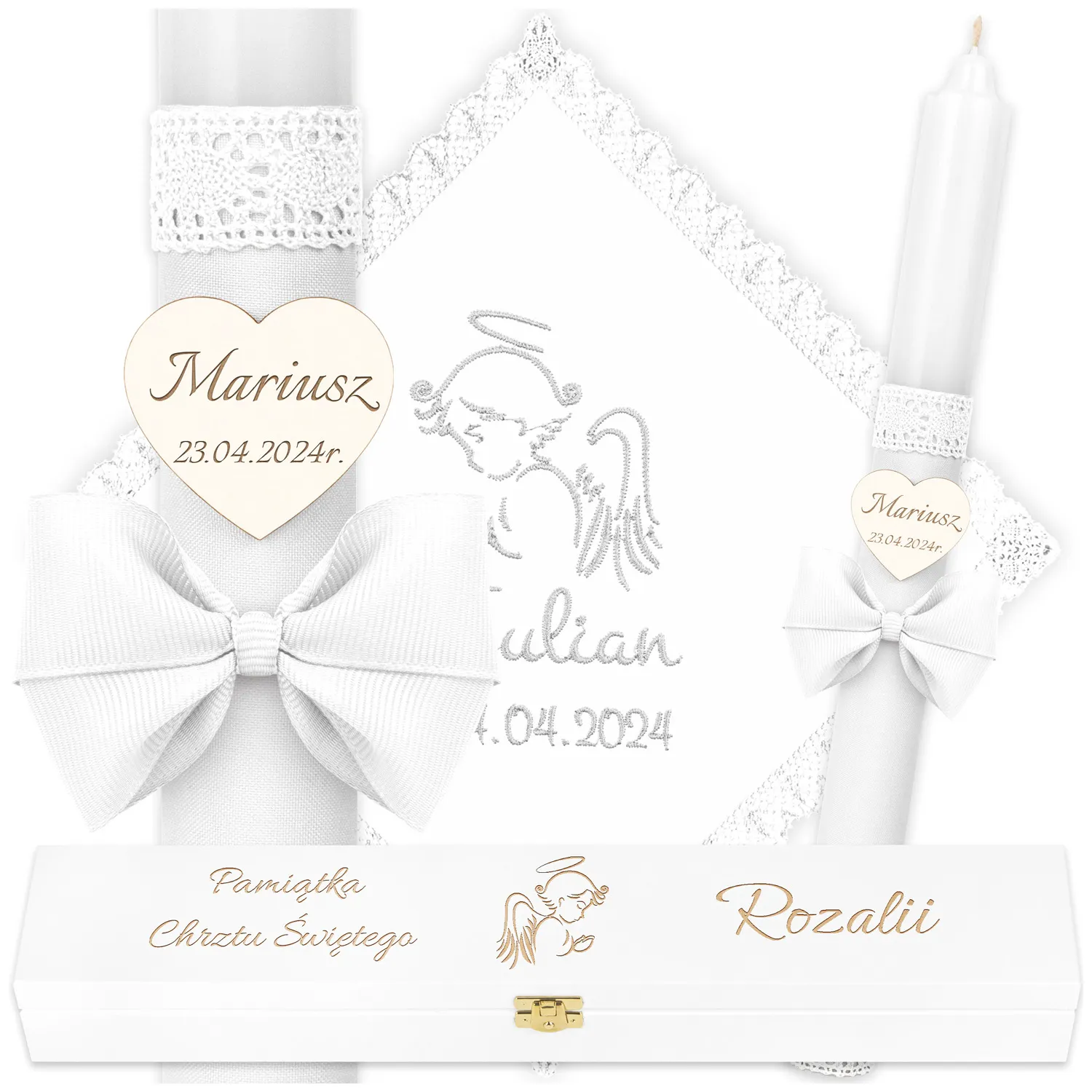 Ręcznie zdobiony zestaw Świeca oraz szatka do Chrztu Świętego.
