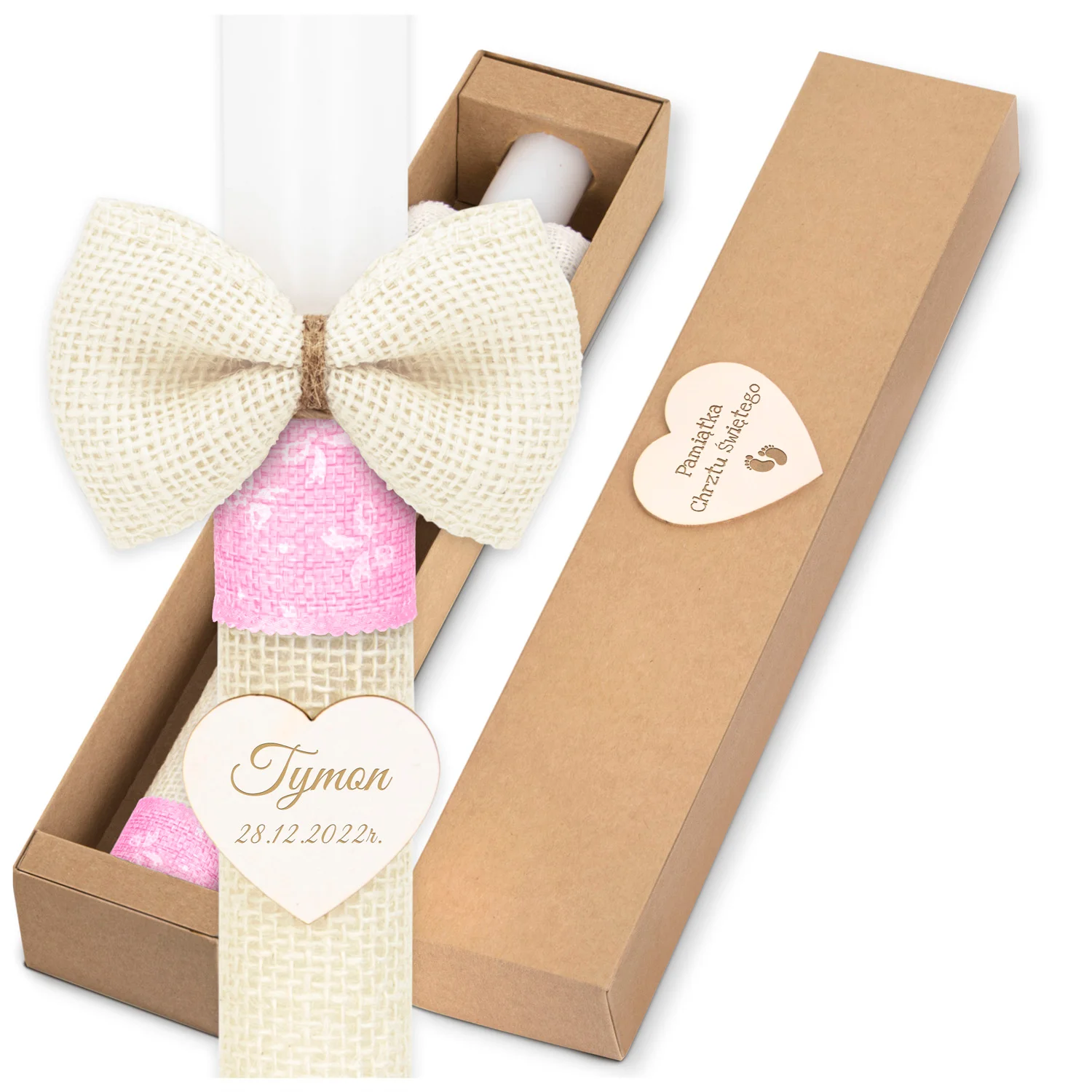 Pod jutową kokardą znajduje się różowa tasiemka z białymi wzorami przypominającymi motyle, co nadaje świecy subtelnego uroku oraz dziewczęcego akcentu. Ta sama tasiemka ozdabia również dolną część świecy, tworząc spójną, elegancką kompozycję. Na środku znajduje się drewniane serce, na którym można wygrawerować imię dziecka oraz datę uroczystości, dzięki czemu świeca stanie się piękną pamiątką tej wyjątkowej chwili.