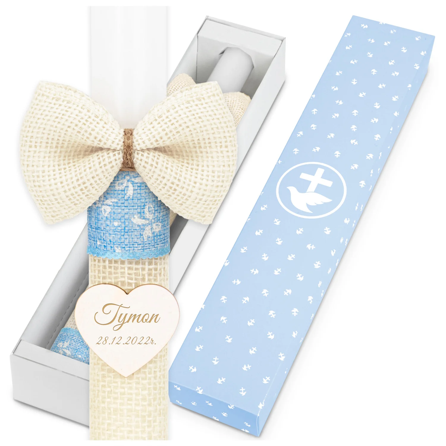 Na środku świecy umieszczono drewniane serce, które możesz spersonalizować grawerem: imieniem dziecka i datą uroczystości. Dzięki temu gromnica do komunii dla chłopca staje się nie tylko elementem liturgicznym, ale także trwałą, symboliczną pamiątką, do której można wracać przez wiele lat po uroczystości.