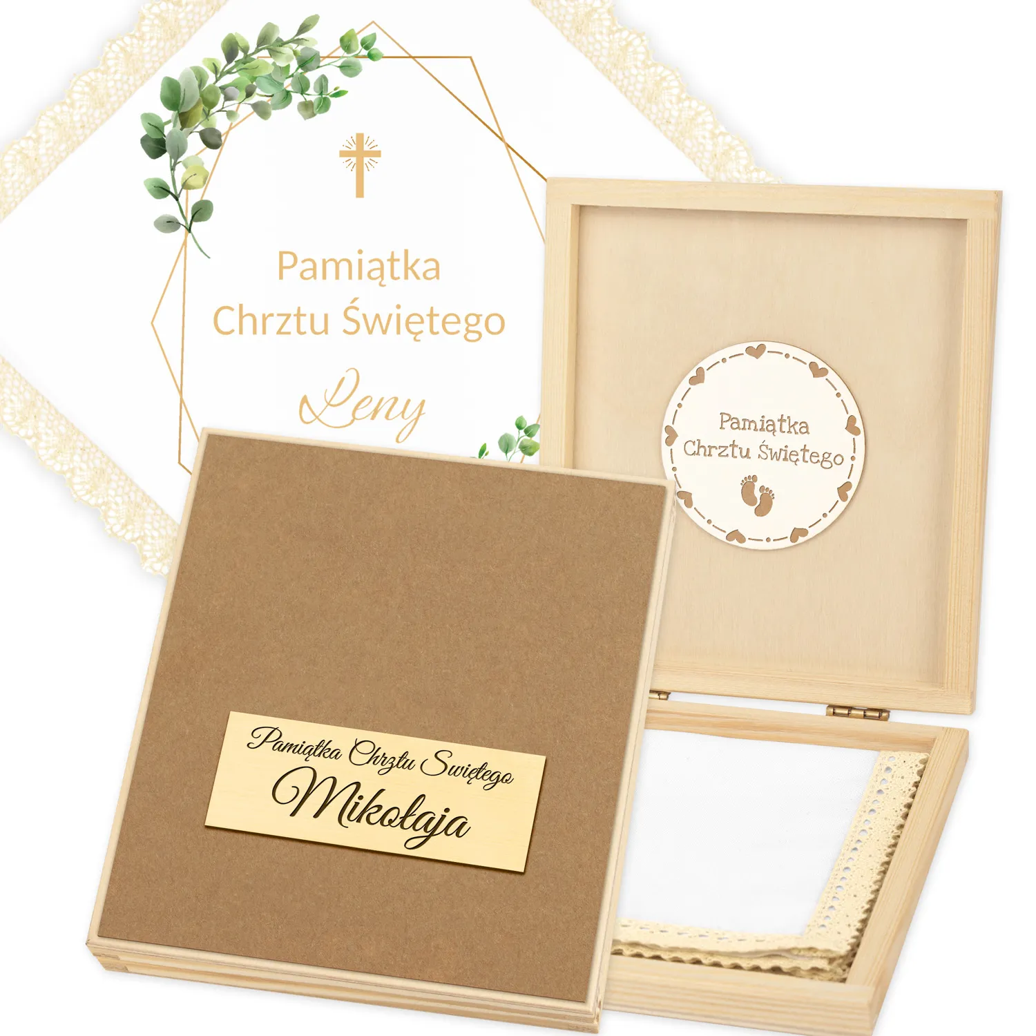 Personalizowane szatka i grawerowane pudełko z imieniem - piękna pamiątka i idealny prezent dla chrześniaka.