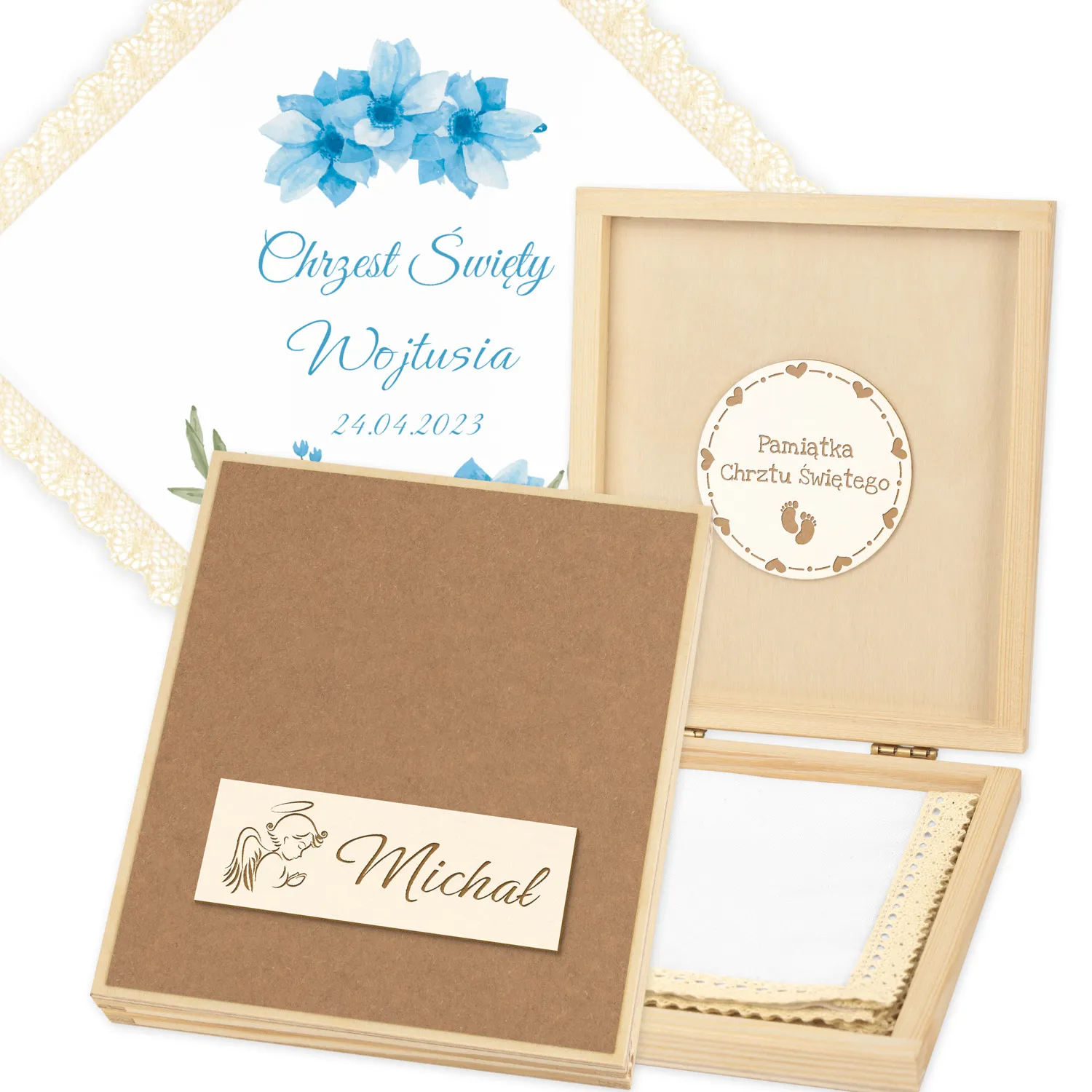 Personalizowane szatka i grawerowane pudełko z imieniem - piękna pamiątka i idealny prezent dla chrześniaka.