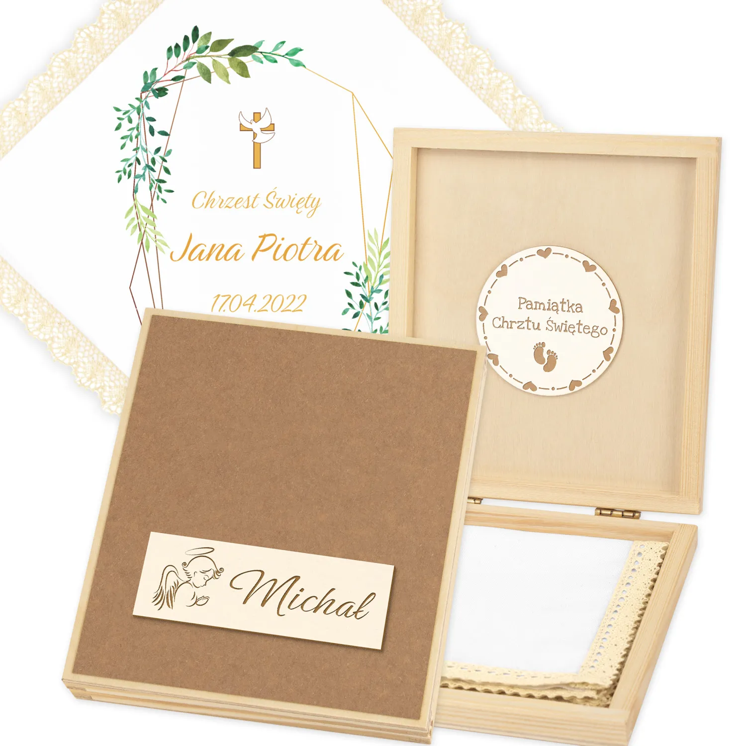 Personalizowane szatka i grawerowane pudełko z imieniem - piękna pamiątka i idealny prezent dla chrześniaka.