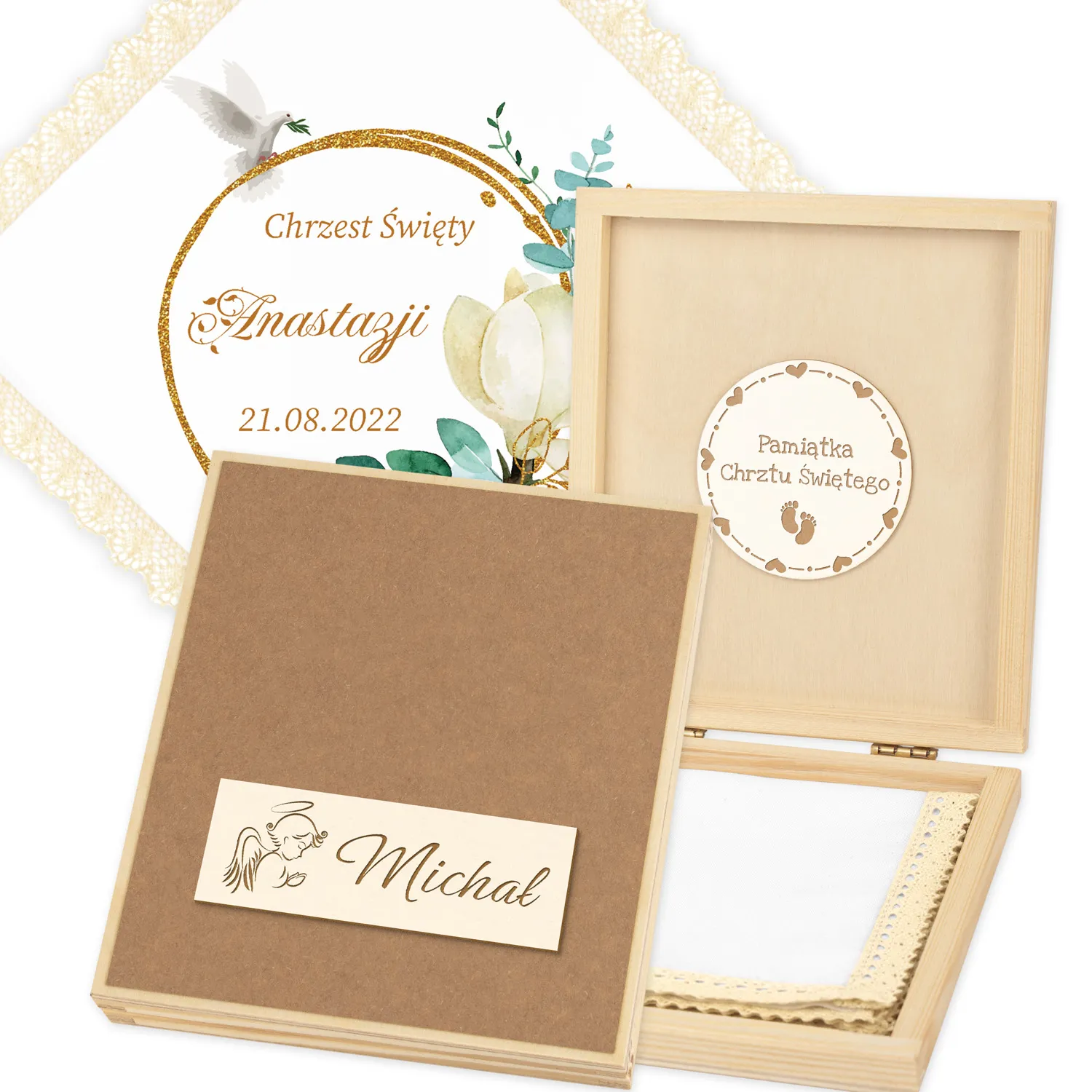 Personalizowane szatka i grawerowane pudełko z imieniem - piękna pamiątka i idealny prezent dla chrześniaka.