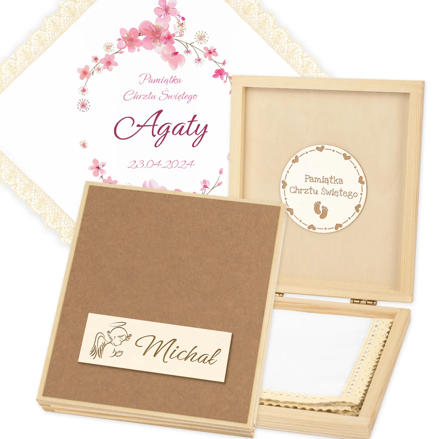 Personalizowane szatka i grawerowane pudełko z imieniem - piękna pamiątka i idealny prezent dla chrześniaka.