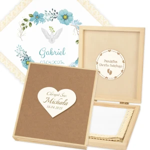 Personalizowane szatka i grawerowane pudełko z imieniem - piękna pamiątka i idealny prezent dla chrześniaka.