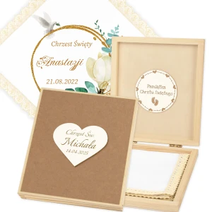 Personalizowane szatka i grawerowane pudełko z imieniem - piękna pamiątka i idealny prezent dla chrześniaka.