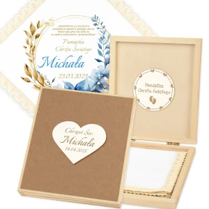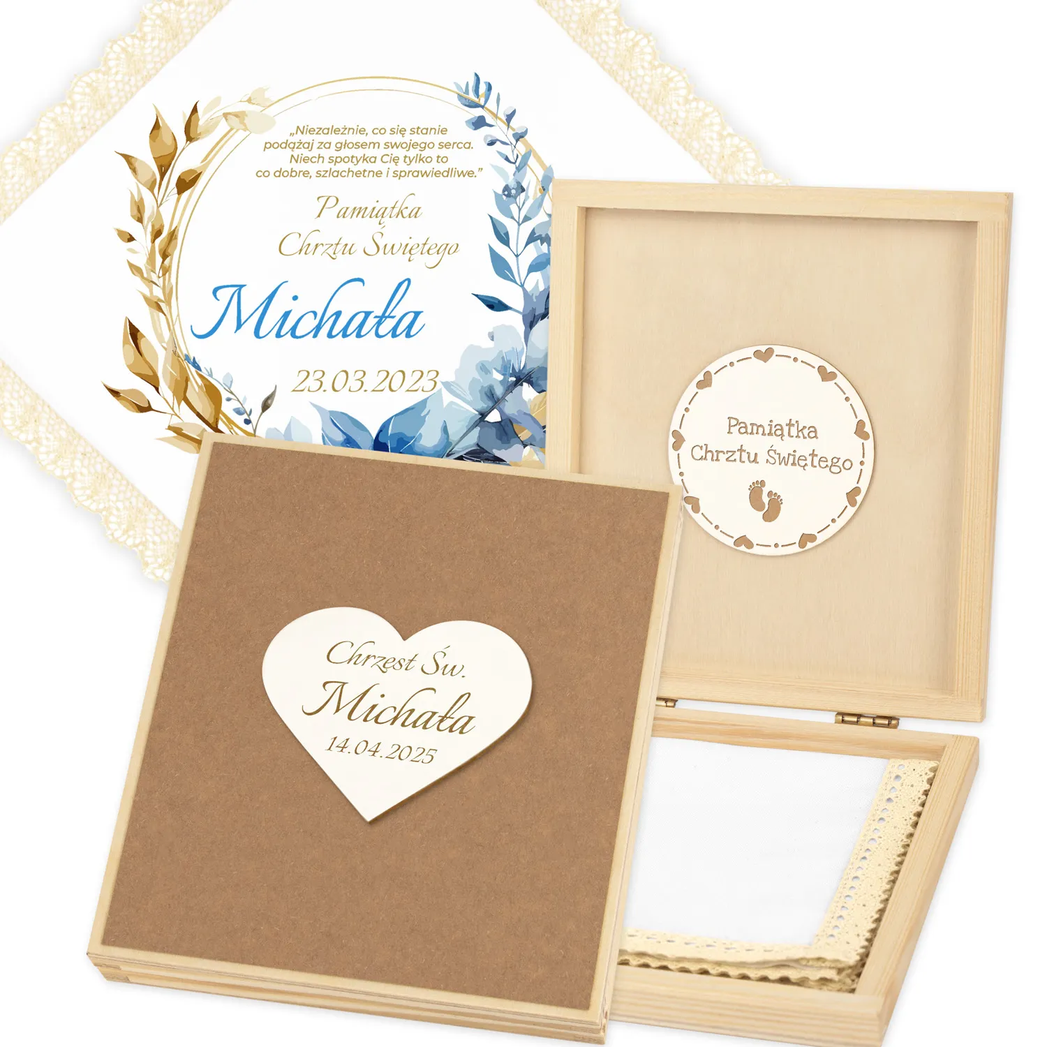 Personalizowane szatka i grawerowane pudełko z imieniem - piękna pamiątka i idealny prezent dla chrześniaka.