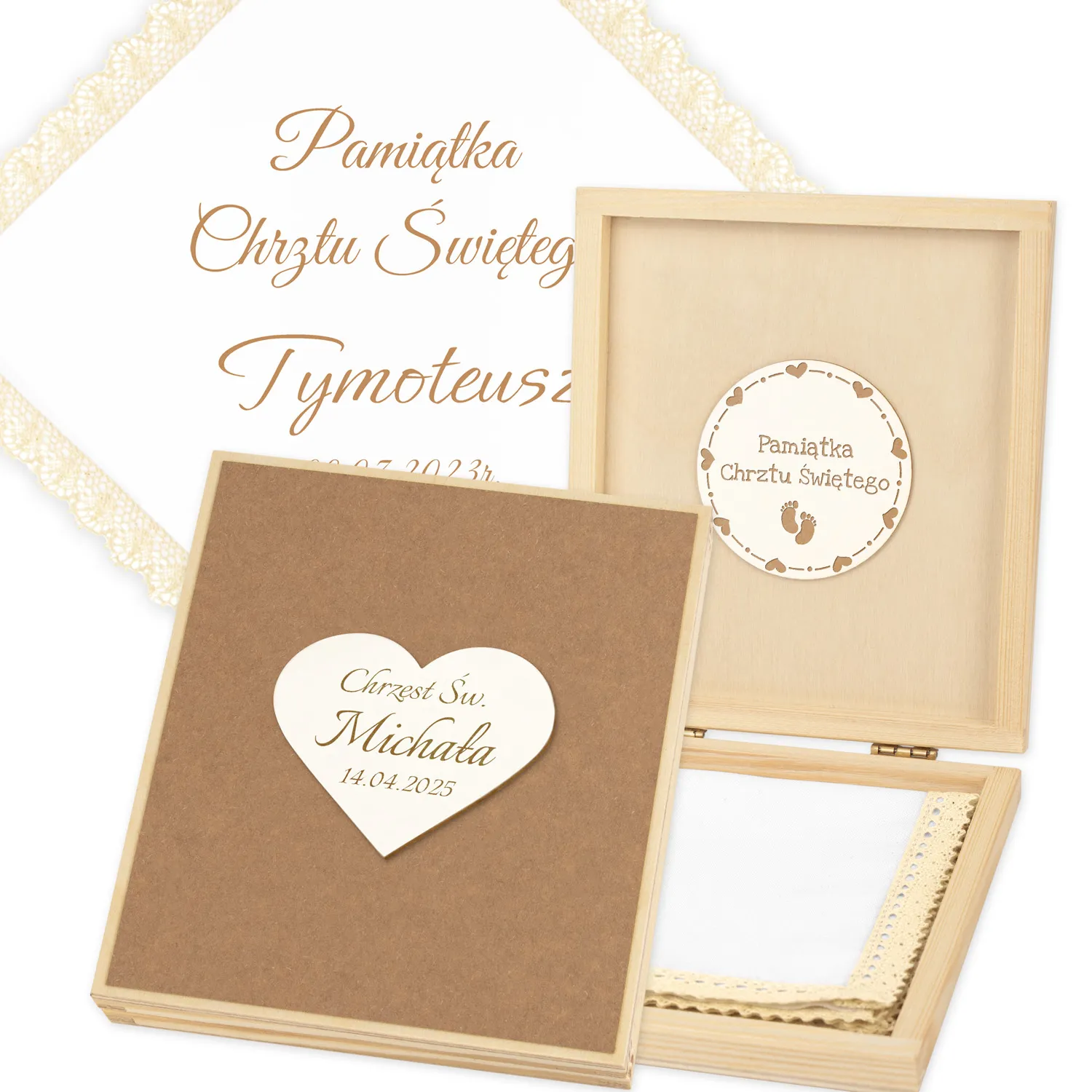 Personalizowane szatka i grawerowane pudełko z imieniem - piękna pamiątka i idealny prezent dla chrześniaka.