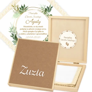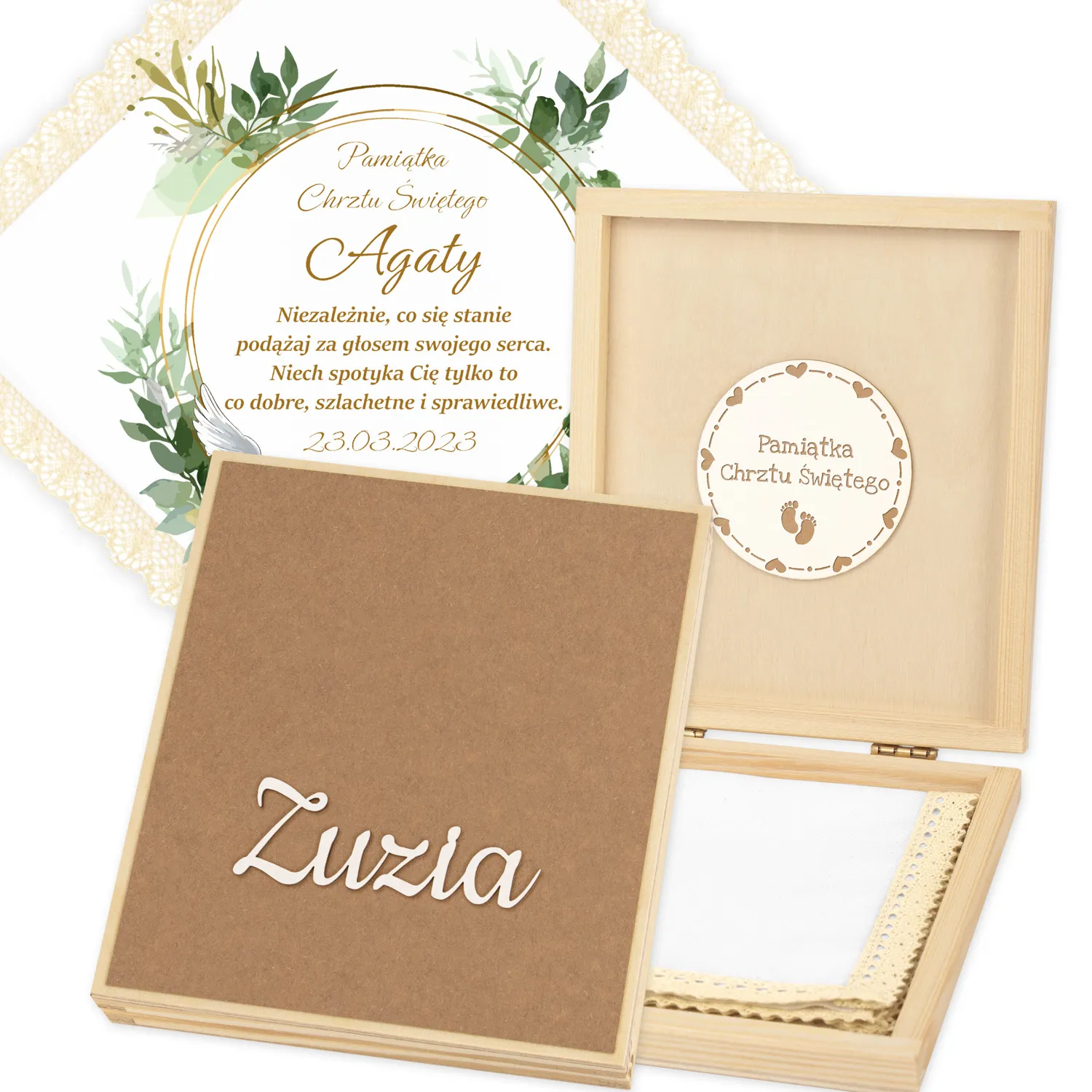 Personalizowane szatka i grawerowane pudełko z imieniem - piękna pamiątka i idealny prezent dla chrześniaka.