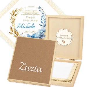 Personalizowane szatka i grawerowane pudełko z imieniem - piękna pamiątka i idealny prezent dla chrześniaka.