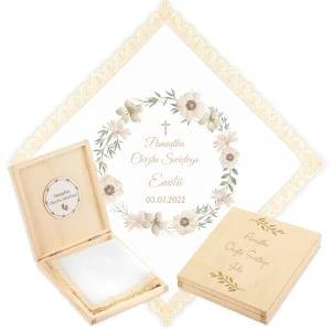 Personalizowane szatka i grawerowane pudełko z imieniem - piękna pamiątka i idealny prezent dla chrześniaka.